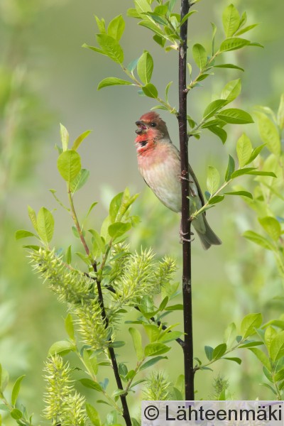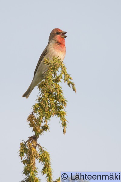 7630 Punavarpunen, Carpodacus erythrinus, koiras, laulaa, pystykuva