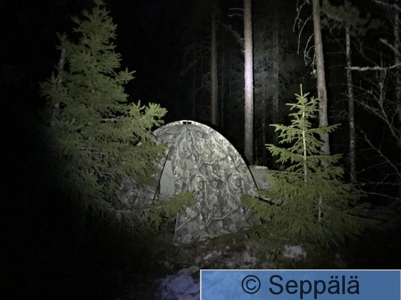 Kangasala Heponiemi Kuvausteltta pimeässä metsässä metson soidinpaikalla vaakakuva