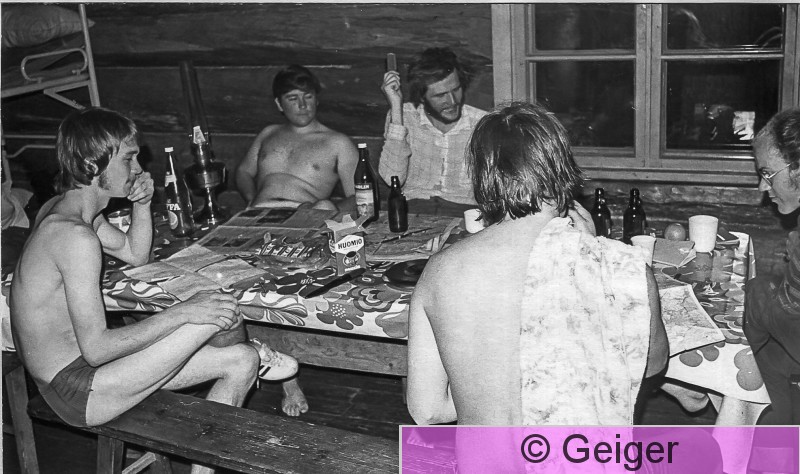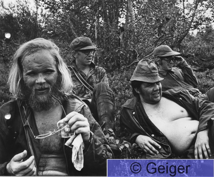 Kuru Seitseminen Jaalan Kämppä Huom: kuvaaja Jyrki Savolainen, julkaisulupa on. PVM ei tarkka: 60/1974Kuvassa TaLy lintuharrastajia Seitsemisen Jaalan kämpässä. Vas.: ?, Risto Salovaara, Mikko Jokinen, ?, Martti Lagerström.