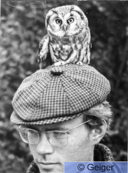 ? Huom: kuvaaja J. Savolainen, julkaisulupa on.Helmipöllö Martti Lagerstömin päässä. Vuosi n. 1970.