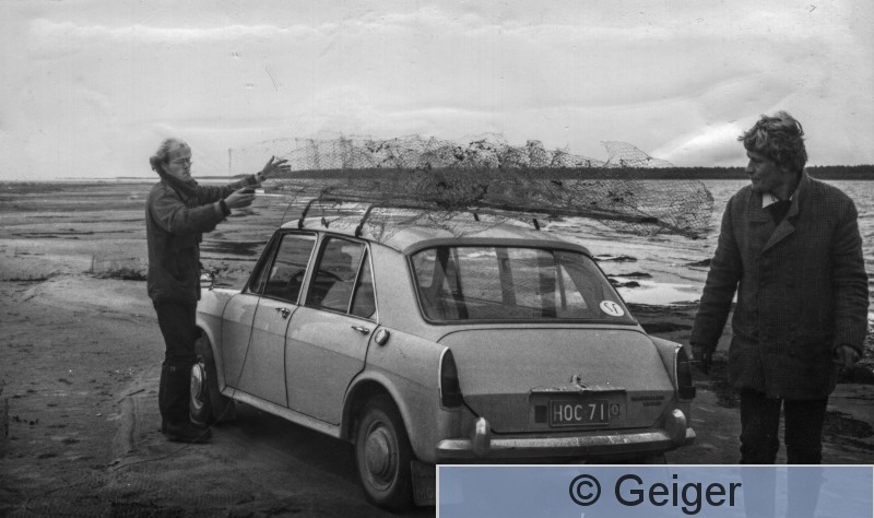 Siikajoki Ulkonokka Huom: kuvaaja J. Savolainen, julkaisulupa on. PVM ei tarkka, syyskuu 1968. Juhani kahlaaja Vuorinen ja Martti Lagerström purkavat kahlaakatiskoita Morris Milerin kyydistä.