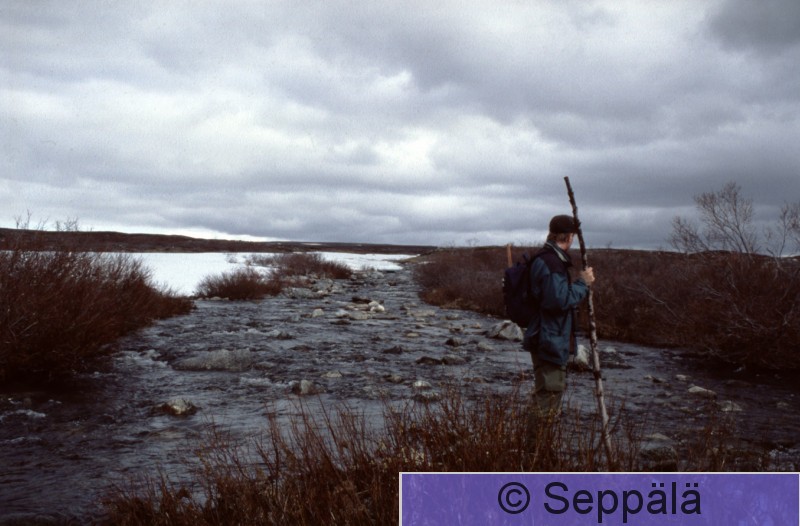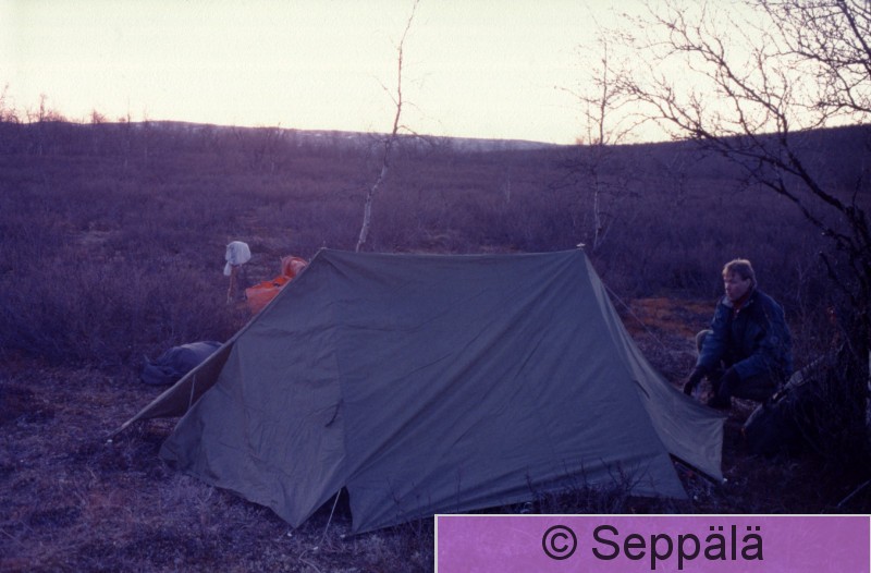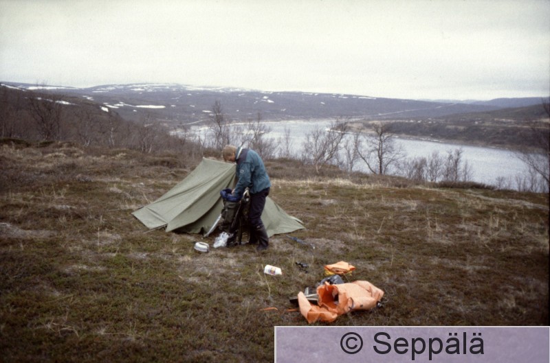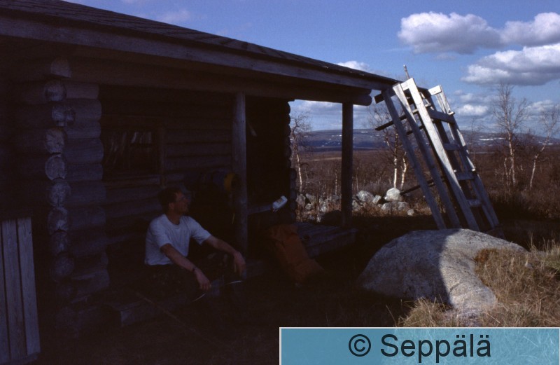 Enontekiö Käsivarren erämaa Buvrrasjohkan kämppä Raimo Seppälä Buvrrasjohkan kämpällä, kuvaaja Petri Seppälä. Retkeilimme Käsivarren erämaassa kaksi viikkoa kesäkuun alussa 2003.