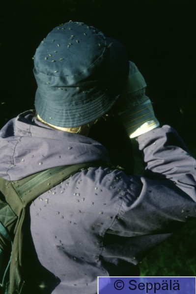 Kuusamo Närängänvaara Retkeilimme reilun viikon Kuusamossa, ja pari päivää Närängänvaaralla. Kuvassa Petri Seppälä ja sääskiä.