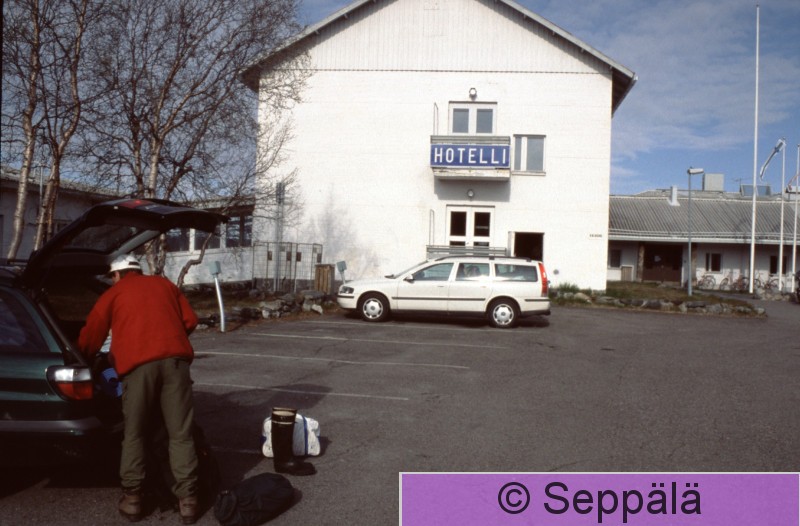 Enontekiö Kilpisjärvi Retkeiltyämme kaksi viikkoa Käsivarren erämaassa kesäkuun alussa 2003 nukuimme yhden yön Kilpisjärven hotellissa ennen kuin lähdimme ajamaan etelään. Kuvassa Petri Seppälä.