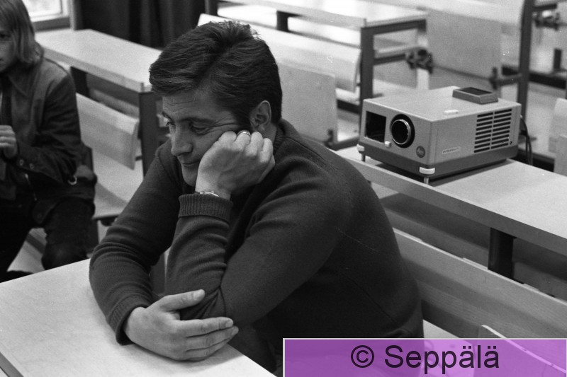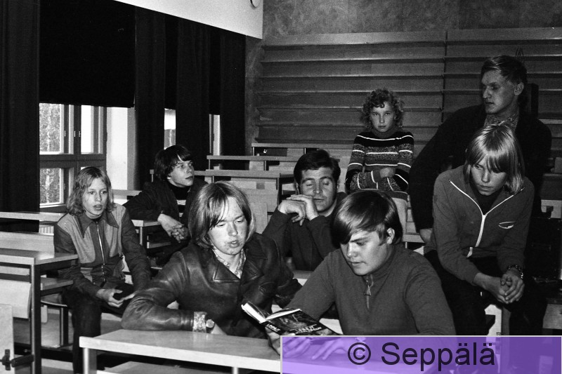 Hämeenkyrö luontokerho Hybridin kokous Hämeenkyrön Yht. Koululla vasemmalta Esko Pasanen, Kalevi Heinonen, Ilari Lumme, Heikki Joukio ed. Jarmo Ojala, Arto Nordfors, Helge Hakalakuka takana vas ??