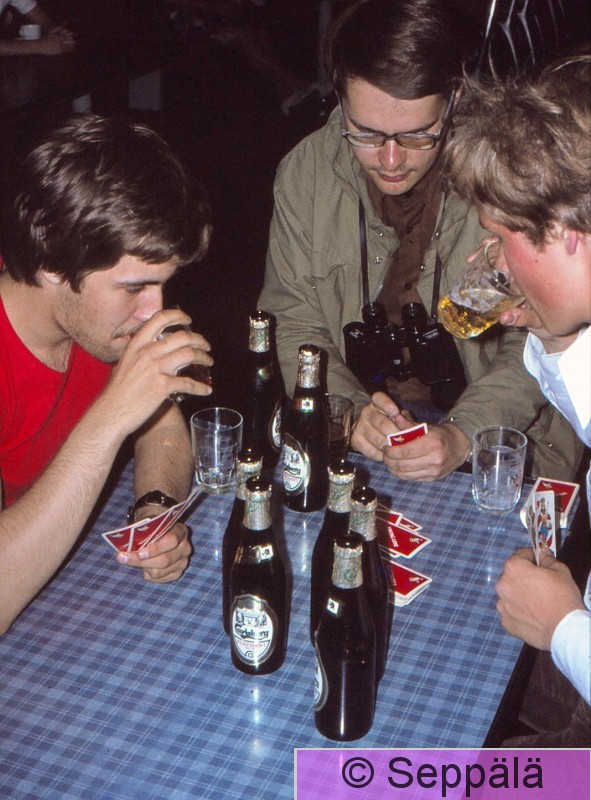 Turun saaristo Sammon yhteislyseon luontokerho Kuorga teki toukokuun lopulla 1978 jokakeväisen 5 vrk kevätretkensä Ahvenanmaalle. Tässä menomatkalla Ruotsinlaivalla Erkki Renvall, Pertti Ranta ja "Namu" (en muista nimeä). Joku nuorimmista retkeläisistä tuli sanomaan, että he uskoivat nähneensä merikotkan kannelta, joka oli tuolloin aika harvinainen. Pelaajat katselivat toisiaan kysyen "Kuka lähtee?". Minä lähdin tarkistamaan havaintoa, ja merikotka se oli. Palatessani otin tämän kuvan.