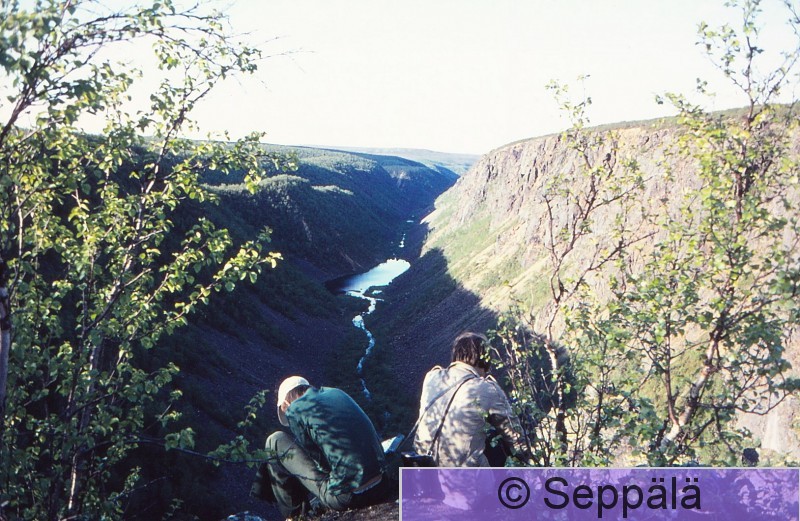 Utsjoki Kevo Kevon kanjonilla heinäkuussa 1975 vasemmalla Teppo Rantanen, oikealla Lasse Kosonen. Vaelsimme kolmistaan luonnonpuiston halki. Paras havainto oli kanjonissa nuori tunturihaukka, joka illalla paneutui nukkumaan jyrkänteellä olleeseen pesään.