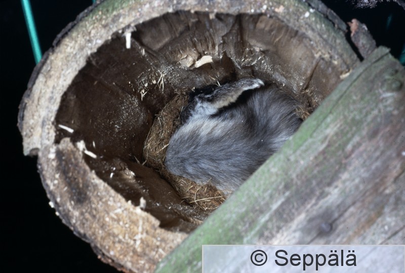 Ikaalinen Luhalahti Sipsiöjärvi Tarkastin pikkulinnunpönttöjä ja sammmaliin oli painautuneena liito-orava. Lentoaukko oli 32 mm ja siinä oli samankokoinen metallilevy suojana, joten pienestä reiästä on mahtunut sisään.