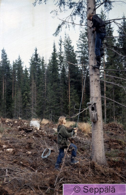 Ikaalinen Pääjärvenperä Pöllönpönttö poistetaan hakkuulle jätetystä kuusesta. Puussa Raimo ja maassa Kirsi Seppälä.