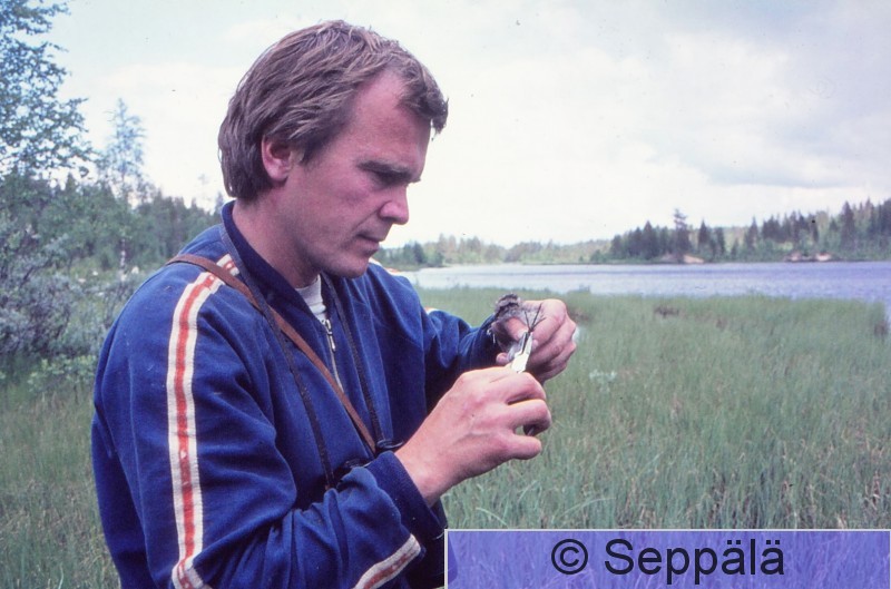 Kainuu Matti Hankela (kuvassa; edesmennyt), Lasse Kosonen ja Raimo Seppälä retkeilivät Kainuussa 1. lintuatlaksen kartoitustyössä n. 1.-15.7.1976. Matti rengastaa liron poikasta.