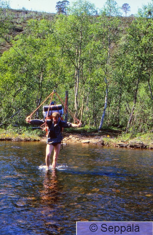 Utsjoki Kevo Raimo Seppälä ylittää jokea Kevon luonnonpuistossa kesäkuun alussa 1986. Vaelsin yksin; kuvan otti toinen yksinvaeltaja.